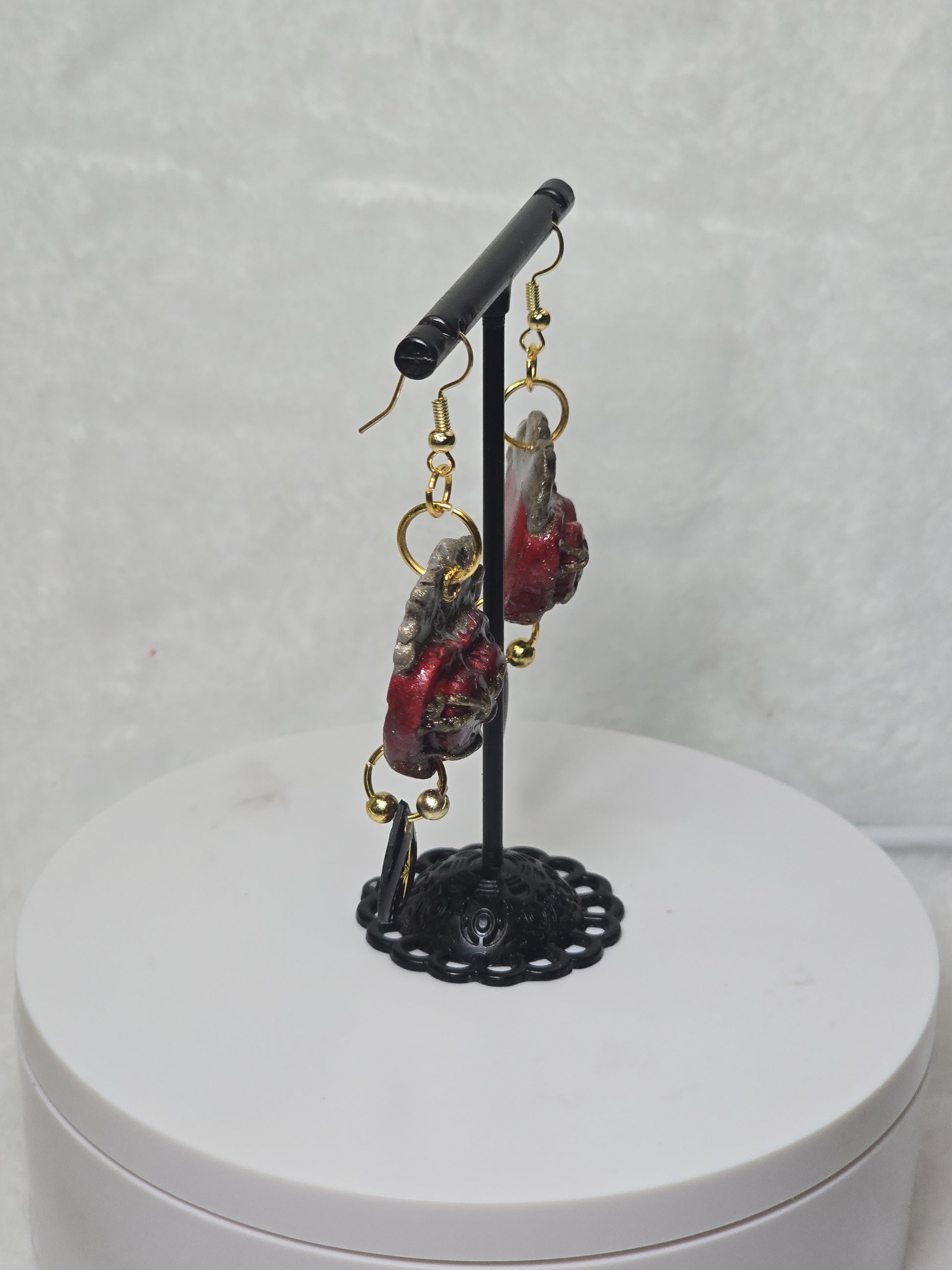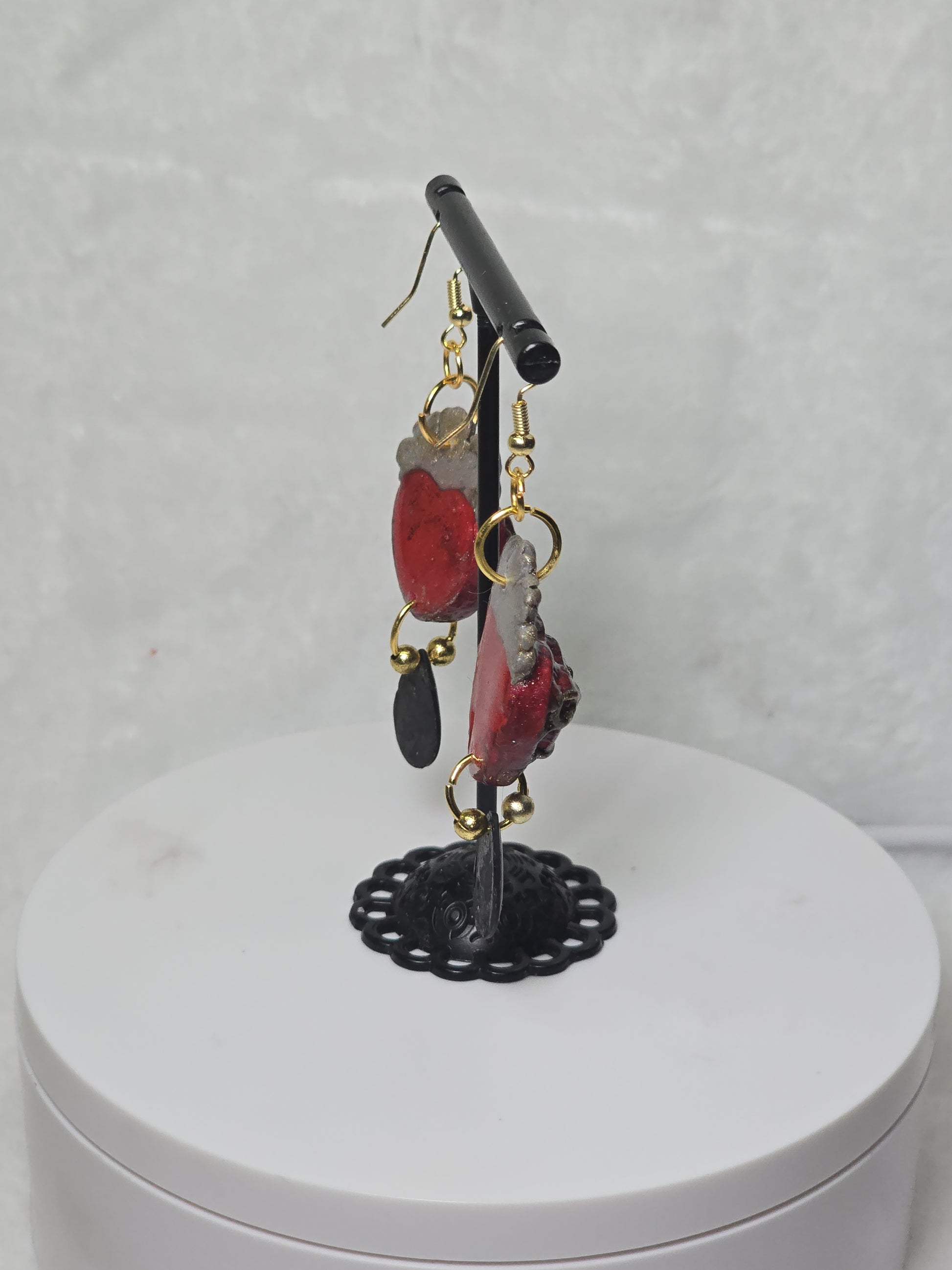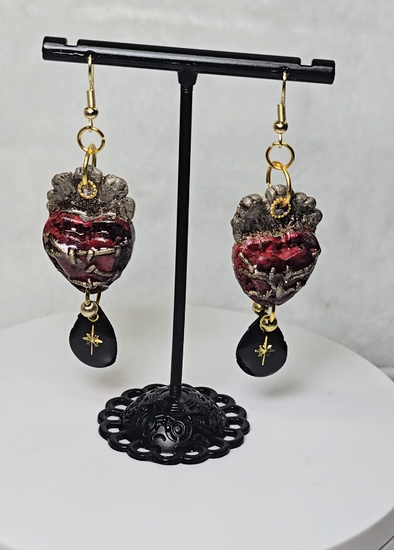 This one-of-a-kind pair features a hand-sculpted gothic heart, bound in barbed wire and crowned in flame. Subtle variations in texture and finish remain visible, preserving the marks of the making process rather than erasing them.