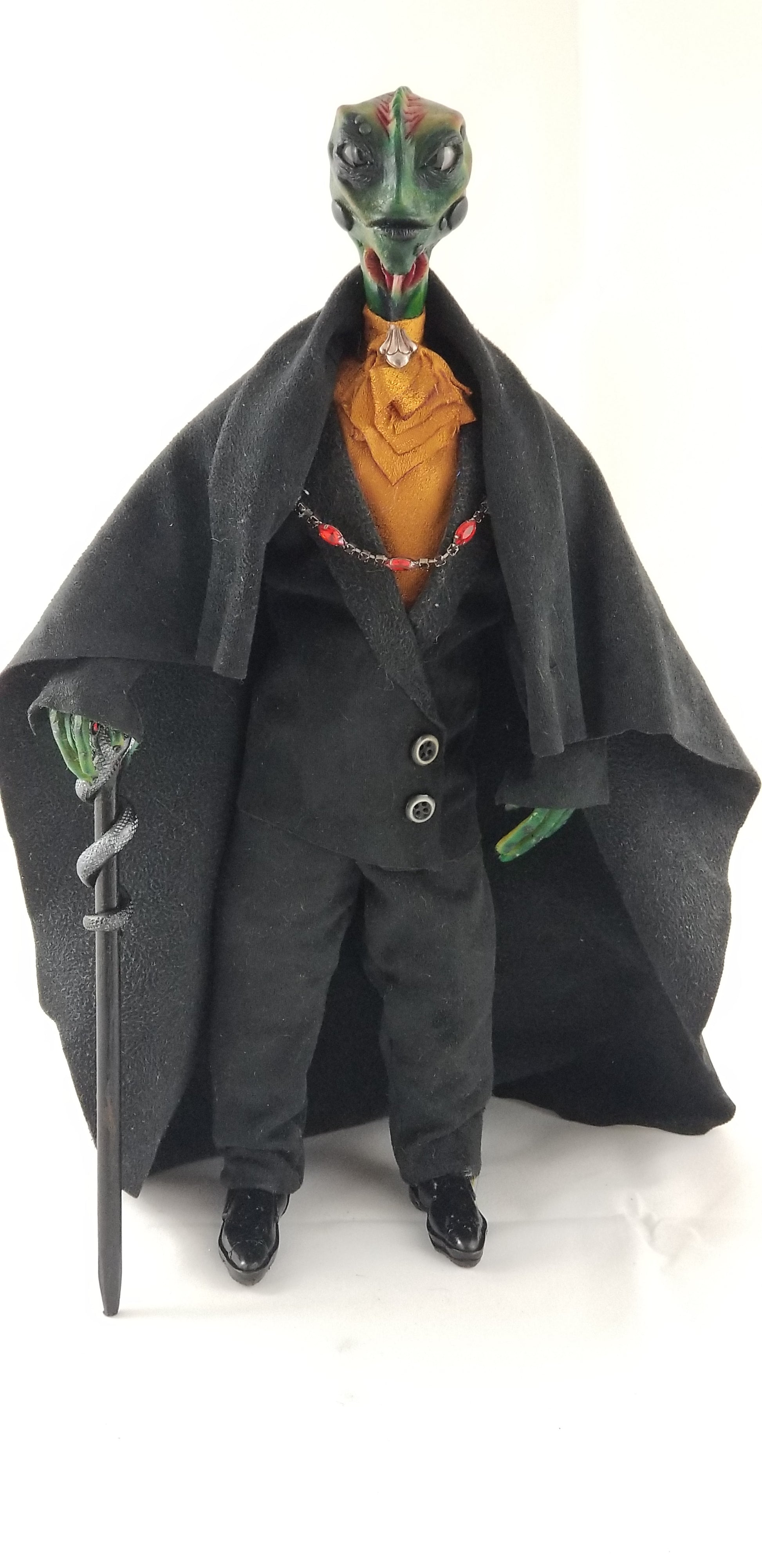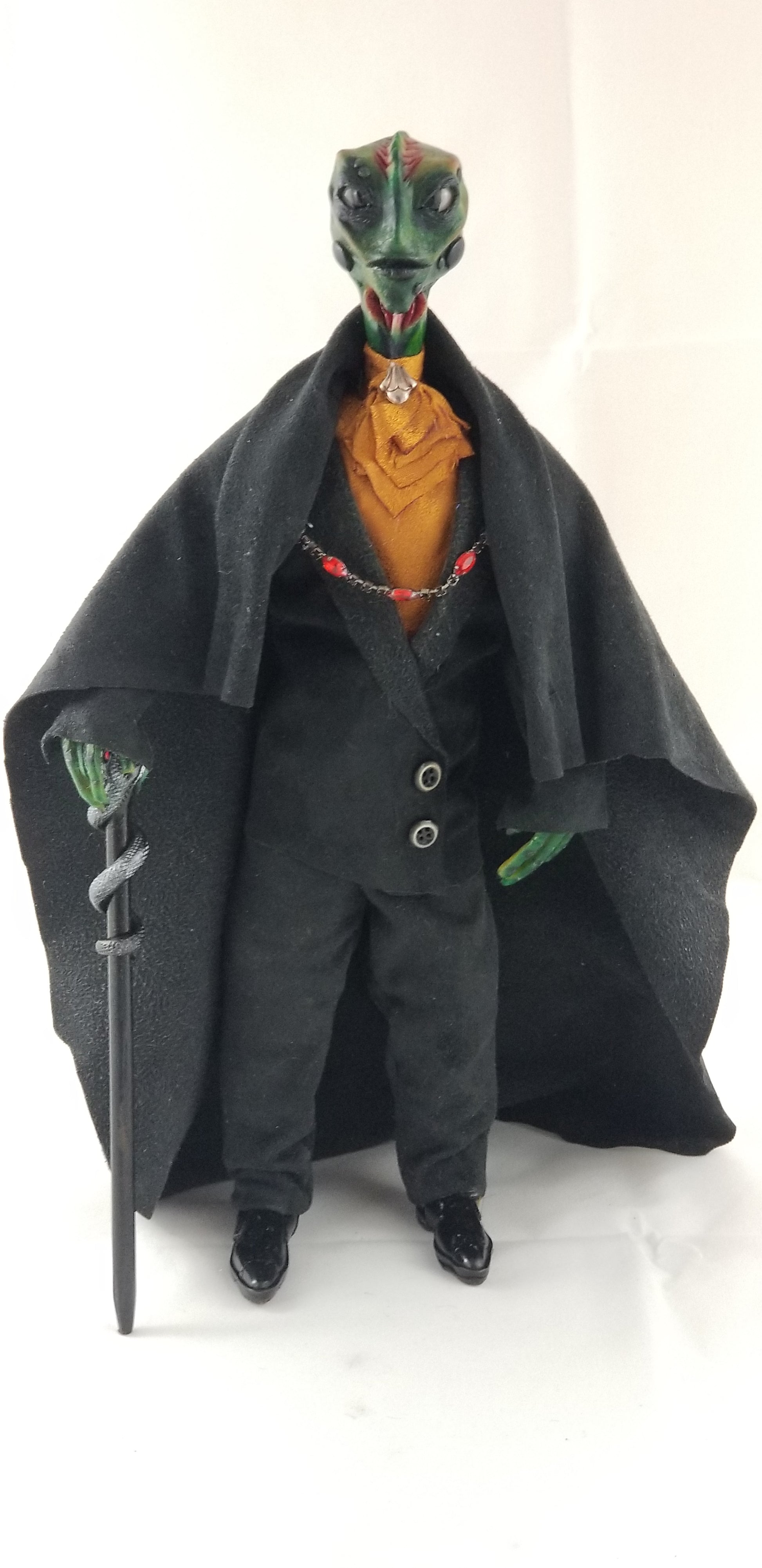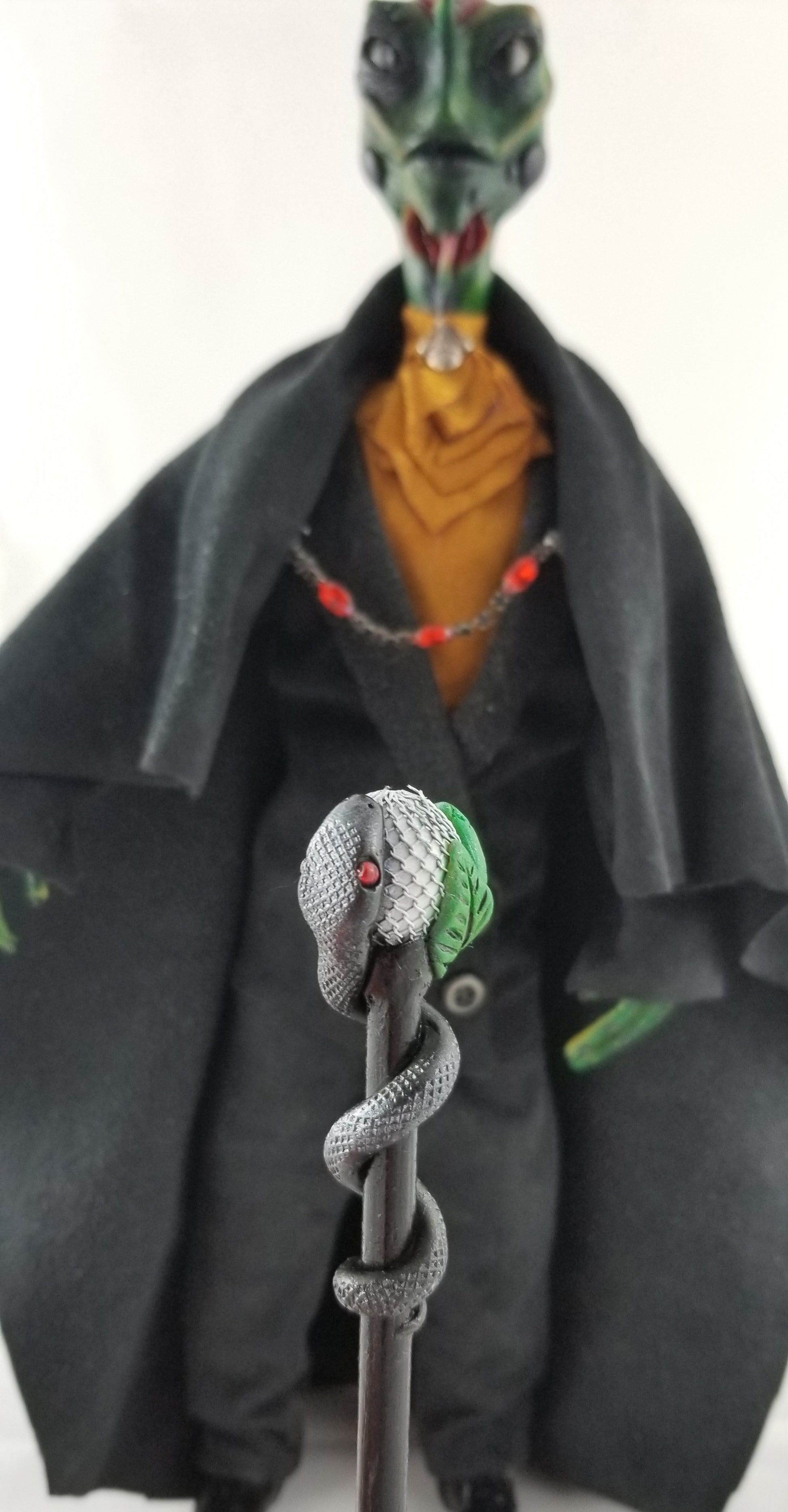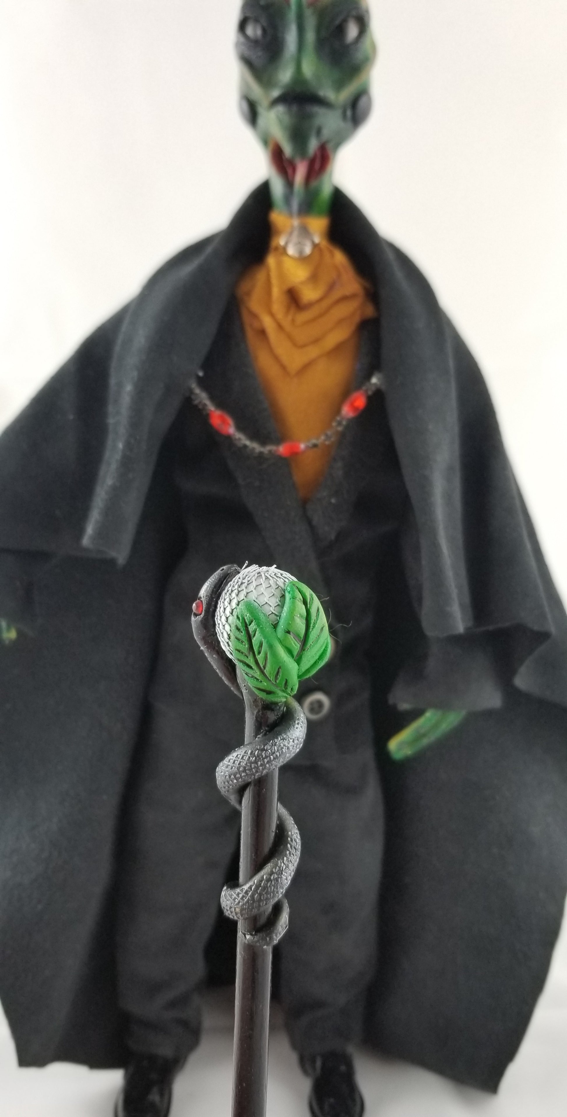 He carries a sculpted staff adorned with a coiled serpent and leaf detail, symbolizing transformation and ancient magic. Every element—from sculpting and painting to sewing and final assembly—has been completed entirely by hand.