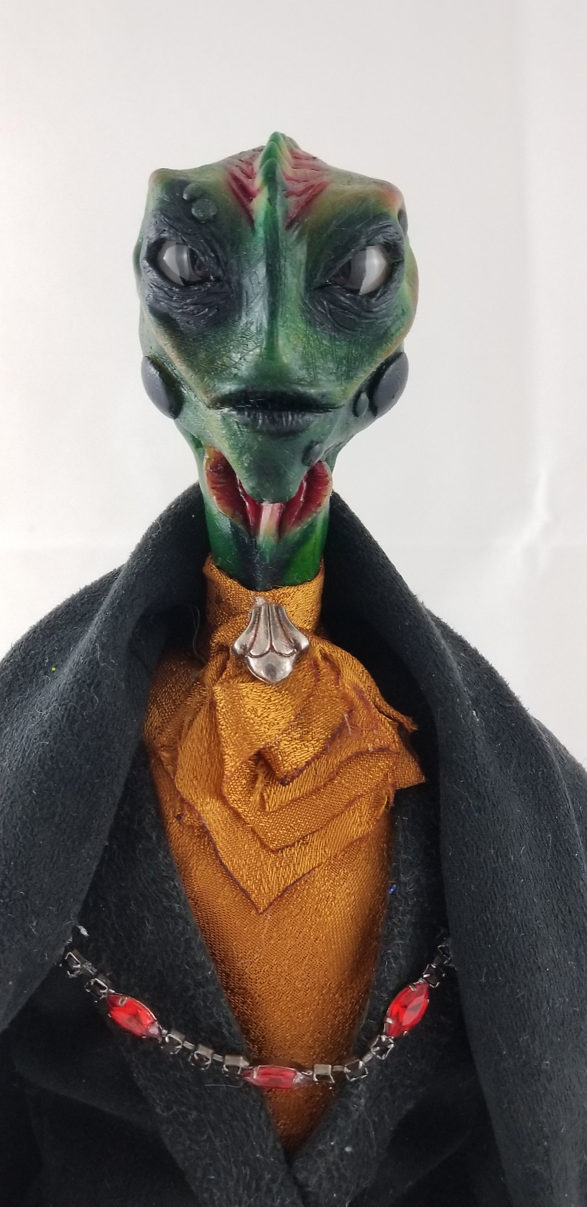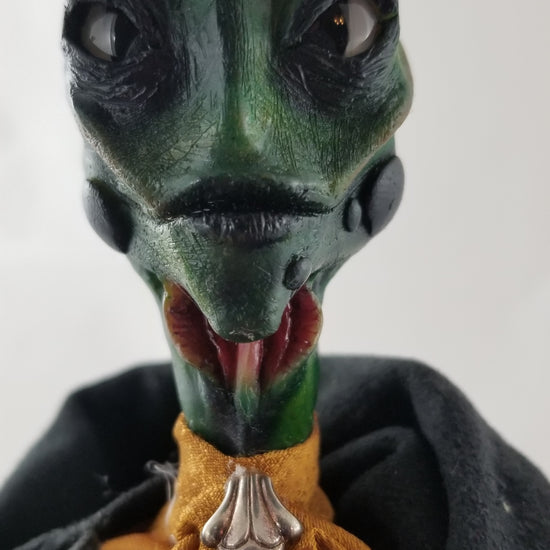 Caspian the Frog Prince is a one-of-a-kind, fully handmade art doll created for collectors and display. His head, hands, and feet are individually sculpted from clay and hand-painted in layered tones of green with subtle crimson detailing, giving him a lifelike, expressive presence.