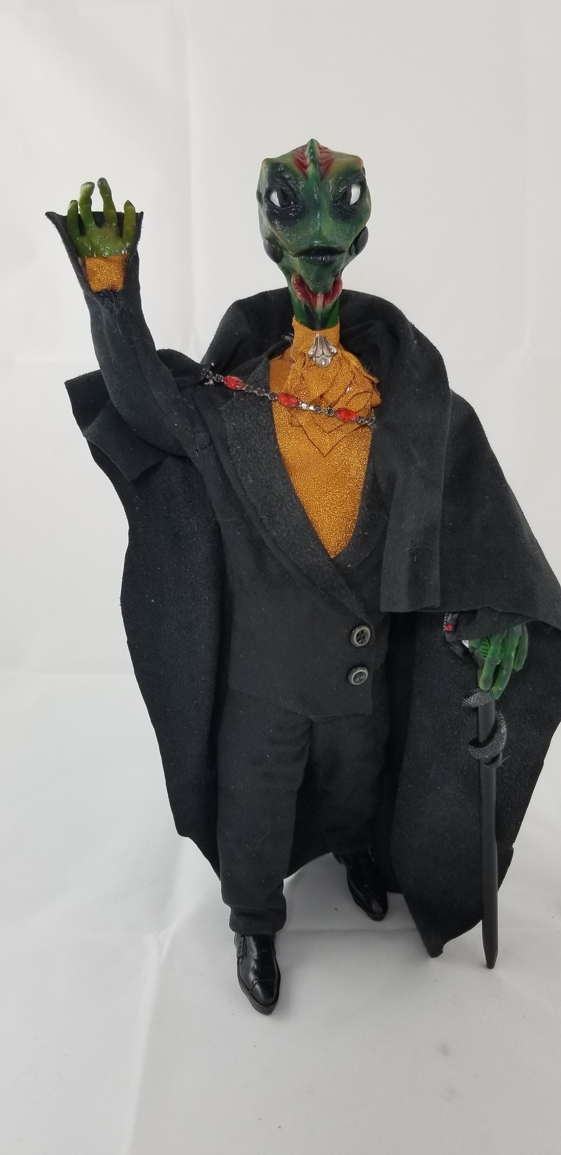 His body is soft, lightly weighted, and fully posable, allowing for gentle posing while maintaining stability for display. Caspian is dressed in a hand-sewn, tailored outfit featuring a black suit, flowing cloak, and a golden cravat accented with a decorative brooch. Each garment was sewn specifically for this doll and cannot be replicated.